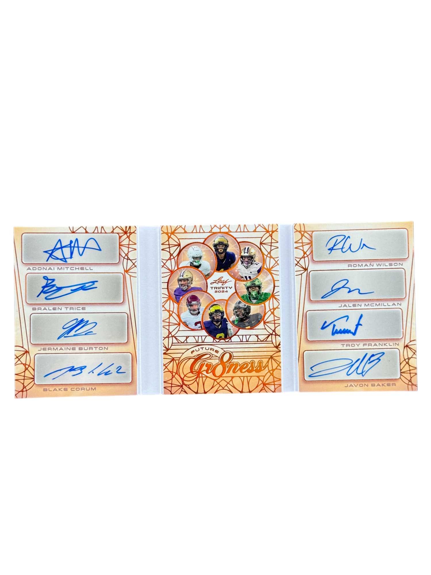 2024 LEAF TRINITY GR8NESS AUTO BOOKLET 8 Players On Card - Corum McMillan Trice Franklin Baker Wilson